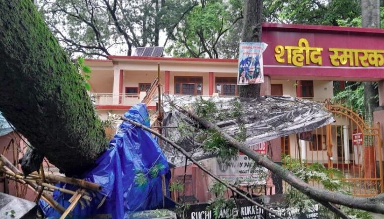 देहरादून कचहरी परिसर में गिरा विशाल पेड़, स्टांप विक्रेता की दुकान हुई ध्वस्त