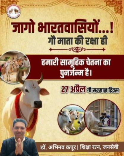 समाजसेवी डॉ. अभिनव कपूर ने कहा- 27 अप्रैल 2026 को देशव्यापी स्तर पर "गौ सम्मान दिवस" या गौ सम्मान आह्वान अभियान मनाया जा रहा है, जिसका उद्देश्य गौ माता को राष्ट्रमाता का दर्जा दिलाने और गौ हत्या पर पूर्ण प्रतिबंध लगाने की मांग करना है।
