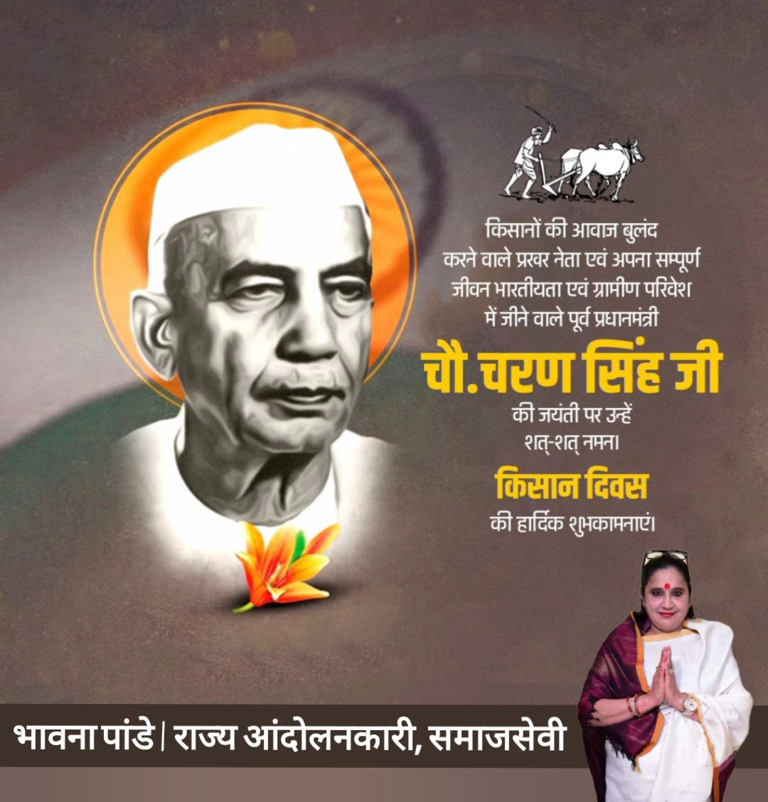जनसेवी भावना पांडे ने कहा- हर साल 23 दिसंबर का दिन भारत में किसान दिवस के रूप में पूरे हर्षोल्लास के साथ मनाया जाता हैं। इस दिन भारत के पूर्व प्रधानमंत्री चौधरी चरण सिंह की जयंती भी मनाई जाती है। कृषि क्षेत्र में चौधरी चरण सिंह के अमूल्य योगदान और किसानों के कल्याण के लिए उनके द्वारा किये गए कार्यों को याद करते हुए उनके जन्म दिवस को ‘किसान दिवस’ के रूप में मनाया जाता है।