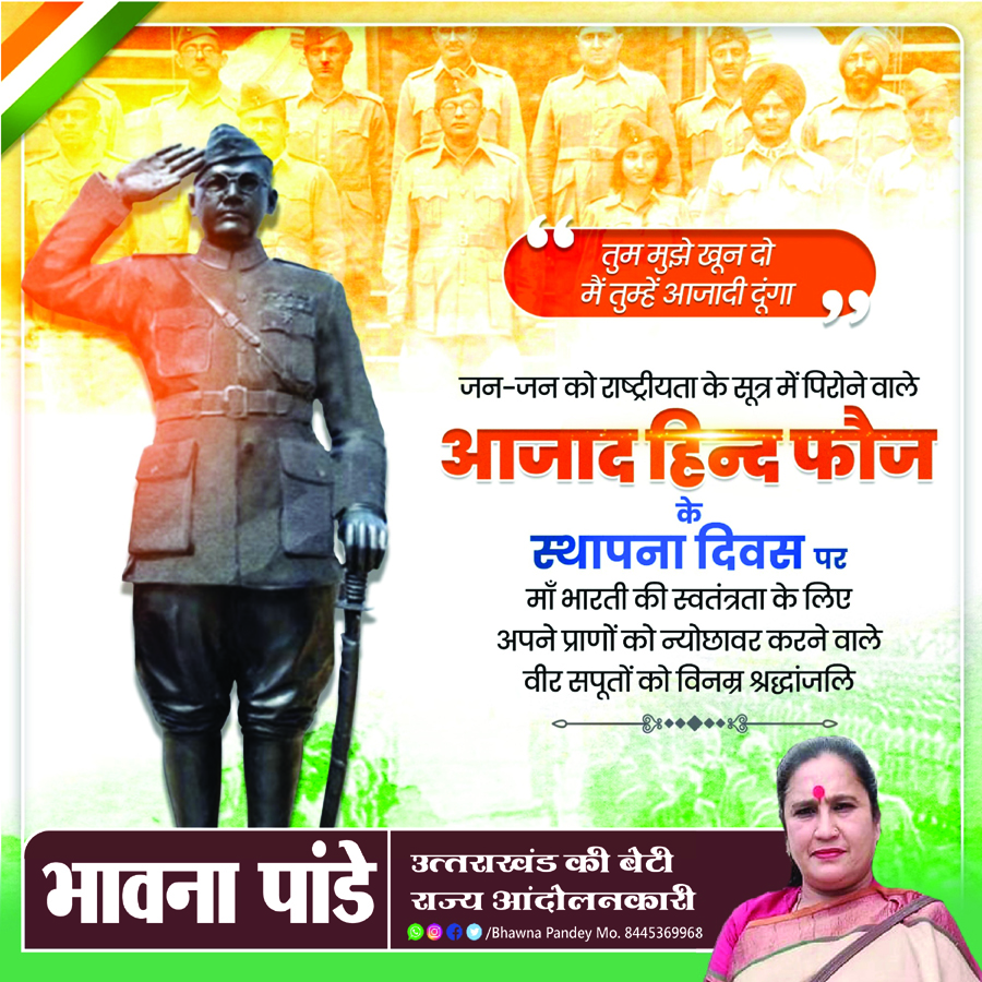 वरिष्ठ राज्य आंदोलनकारी भावना पांडे ने ‘आजाद हिन्द फौज के स्थापना दिवस’ पर अपने संदेश में कहा- भारतीय स्वाधीनता संग्राम की हुंकार, राष्ट्रनिष्ठा की ज्वाला, आजाद हिन्द फौज के स्थापना दिवस पर माँ भारती के वीर सपूतों को शत-शत नमन! यह दिवस केवल एक संगठन के जन्म का स्मरण नहीं, बल्कि उस ज्वाला का स्मरण है, जिसने राष्ट्र-आराधना को रण-आह्वान बनाया, परतंत्रता की बेड़ियों को तोड़ने का साहस दिया और स्वतंत्र भारत के स्वर को समूचे विश्व में गूंजित किया।