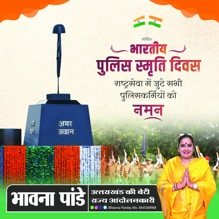 उत्तराखंड की बेटी भावना पांडे ने अपने संदेश में कहा- “कर्तव्य पथ पर अपना सर्वस्व अर्पित करने वाले सभी अमर बलिदानी पुलिस कार्मिकों को ‘पुलिस स्मृति दिवस’ पर विनम्र श्रद्धांजलि!” देश के पुलिस कार्मिकों की सेवा और कर्तव्यनिष्ठा समाज के लिए एक आदर्श मॉडल है। उनका बलिदान राष्ट्र की आत्मा में अमिट प्रकाश बनकर सभी को प्रेरित करता रहेगा।