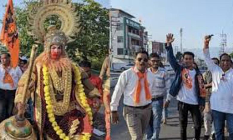 हनुमान जयंती पर नेहरू ग्राम क्षेत्र में भव्य शोभा यात्रा निकलते शिव सेना कार्यकर्ता