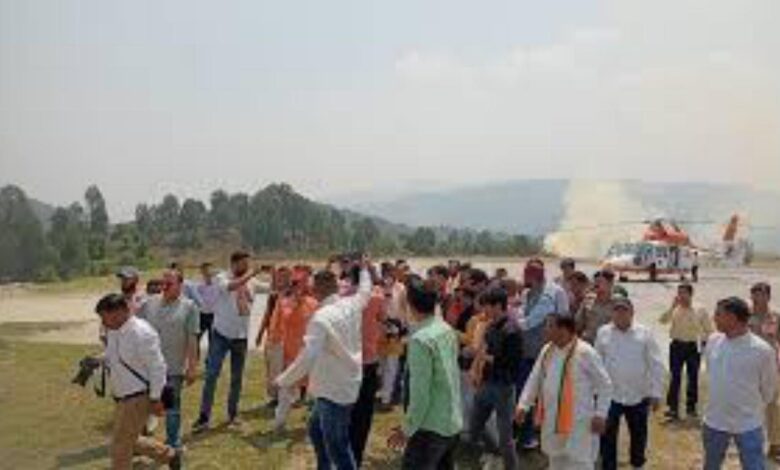 गरुड़ के मेलाडूंगरी हैलीपैड पहुंचे सीएम पुष्कर सिंह धामी को कार्यकर्ताओं ने जोरदार स्वागत किया